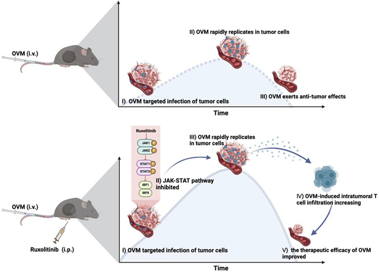 颜光美教授团队长期致力于溶瘤病毒的M1的高效抗癌研究,于2014年首次将其鉴定为一种新型溶瘤病毒,并围绕其选择性抗癌的机制开展了系列研究,推动其在中国和日本进入临床试验,并在美国获肝癌和胶质瘤的孤儿药资格认定。在本研究中,研究人员系统解析了溶瘤病毒M1在免疫健全小鼠体内的药动学特征,并鉴定了JAK-STAT通路对其分布和代谢起关键调控作用。在此基础上,研究人员通过使用临床药物鲁索替尼成功改善了溶瘤病毒M1的药动学特性,进一步提升了其抗肿瘤疗效和机体免疫激活水平。
