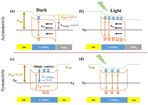 图4. 非对称电极型Au/CsPbBr3/SmB6器件和对称电极型Au/CsPbBr3/Au器件在明暗条件的能带图