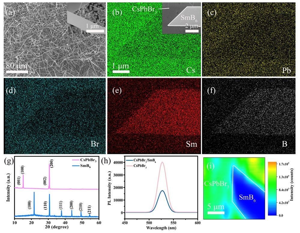 图2. CsPbBr3/SmB6肖特基的表面形貌、结构表征和荧光发光特性