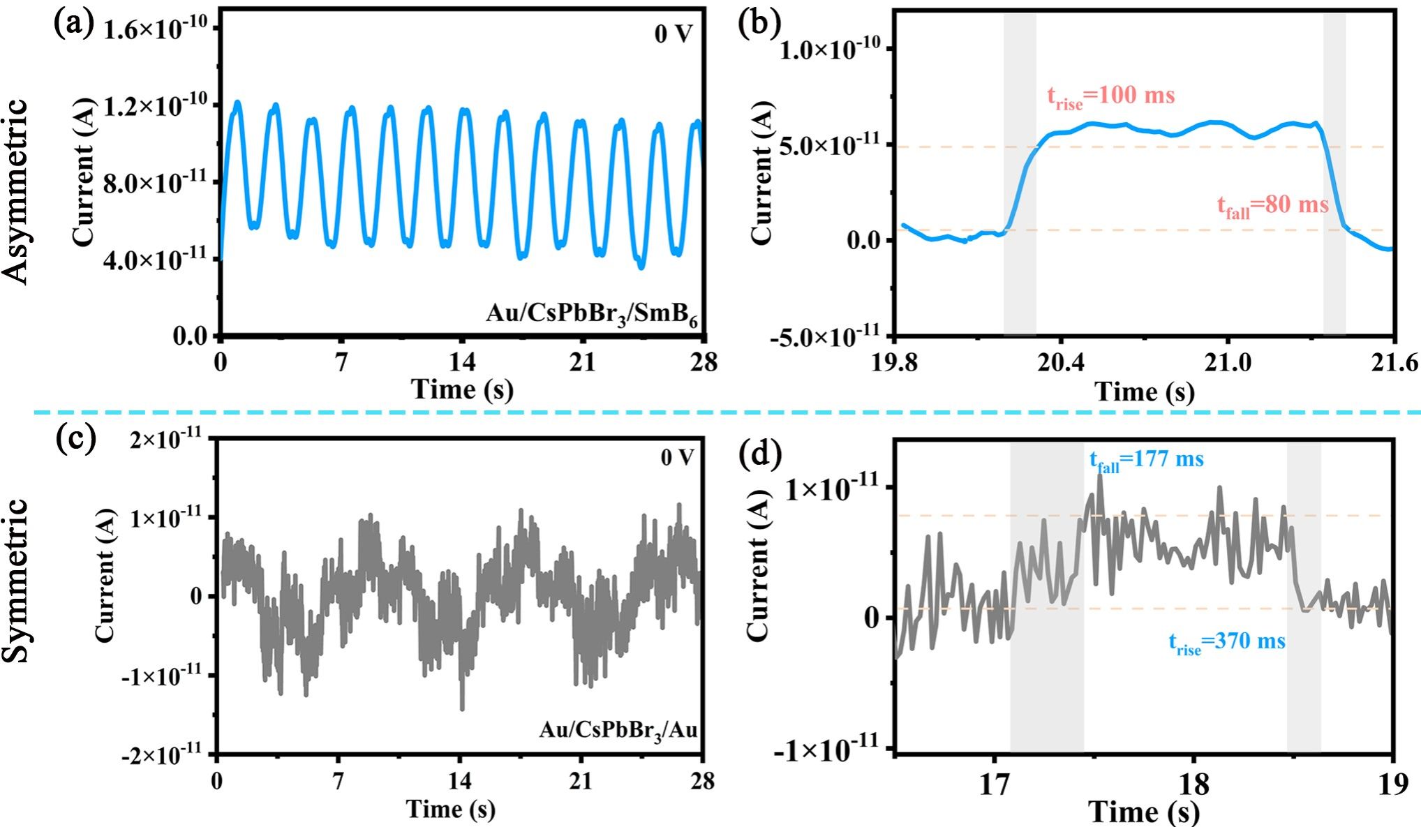 图3. 非对称电极型Au/CsPbBr3/SmB6器件和对称电极型Au/CsPbBr3/Au器件在零偏压下的时间响应曲线
