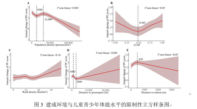 该研究结果揭示了城市建成环境与体质健康之间的复杂关系(图2)。特别是,人口密度与体质健康之间呈现出倒‘N’型关联,提示适当的人口密度可能更有利于提升城市资源获取的公平性,进而促进儿童青少年体质健康。同时,该研究显示,居住地到最近公共交通站点的距离在不超过470米时,与更好的体质健康相关联,这可能与增加的步行或骑行活动密切相关。