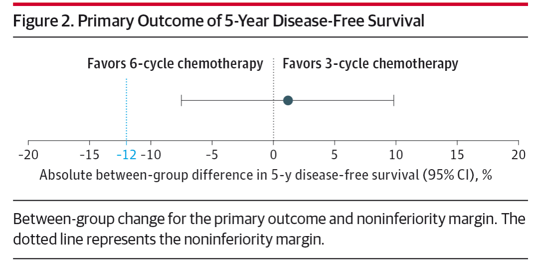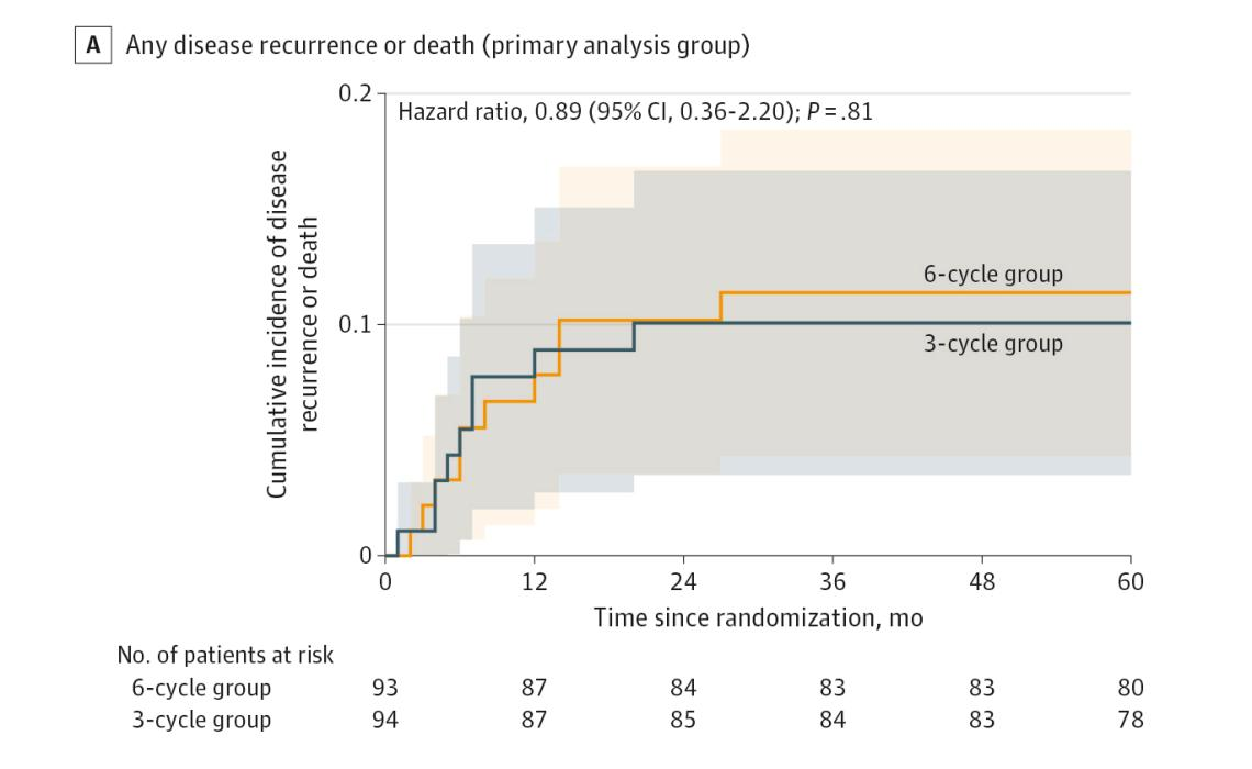 研究结果显示,在主要结局指标(5年无病生存率)方面,3疗程组和6疗程组分别为90.4%和89.2%,无显著差异。此外,在5年总生存率方面,两组也无统计学差异(91.5% VS 89.3%)。