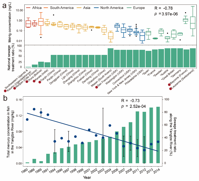 (a)全球城市水域的甲基汞水平与国家污水处理率呈显著负相关;