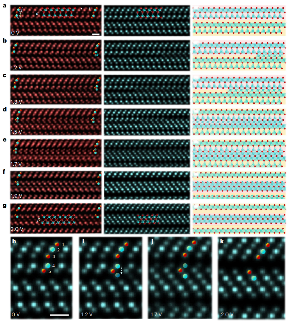 研究团队选择了铁电二维层状In2Se3作为研究对象,利用外部电压(或电流)外场调控,通过可控电流驱动相变的方法,结合原位球差扫描透射电子显微镜技术,揭示了二维层状In2Se3材料从半导体相(2H-α相)到半金属相(2H-β相)的层间相变机制。观察到了电压诱导下的相变起始于材料的局部缺陷区域,随后逐渐蔓延至整个材料,此过程中伴随着导电性的显著变化。首次揭示了In2Se3相变材料的2H-α到2H-β相变先后经历层内劈裂(即层内结构的分离)和层间重构(即层间结构的重新组合),与以往层内原子重排路径的传统猜测和认识明显不同。