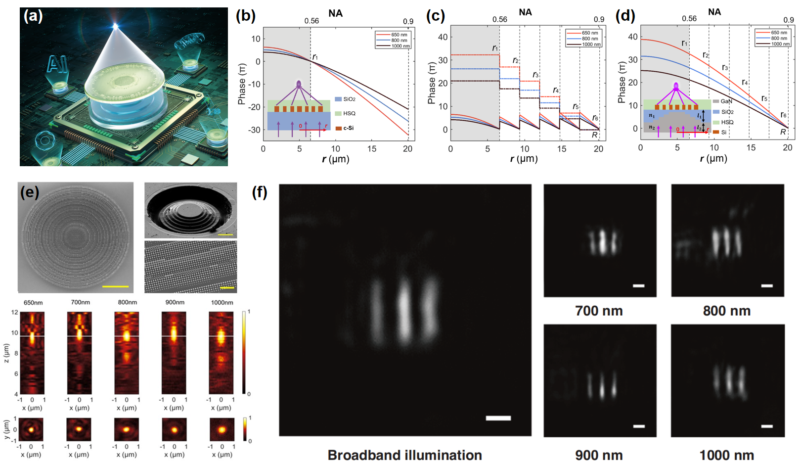 图1:“高大宽”消色差平面透镜的物理设计、器件特征、聚焦性能及成像性能