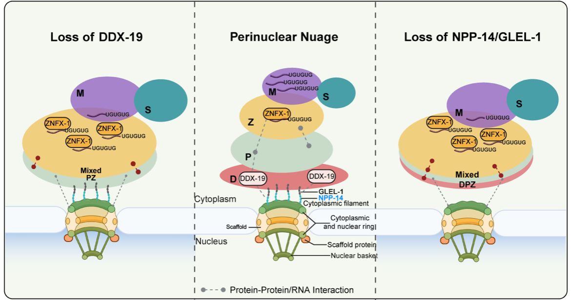 该研究在秀丽隐杆线虫中发现,保守的DEAD-box RNA解旋酶DDX-19在核孔纤维与已知生殖颗粒亚区室(P、Z、M、S)之间,形成一个独立的具有液相凝聚物特性的新区室,称之为D区室。D区室依赖于保守的核孔纤维蛋白NPP-14和GLEL-1锚定在外核膜。DDX-19、NPP-14或GLEL-1的缺失会导致功能缺陷:包括其他四个生殖颗粒区室的结构重排、生殖细胞永生性的丧失以及基于小RNA的TEI的失调。