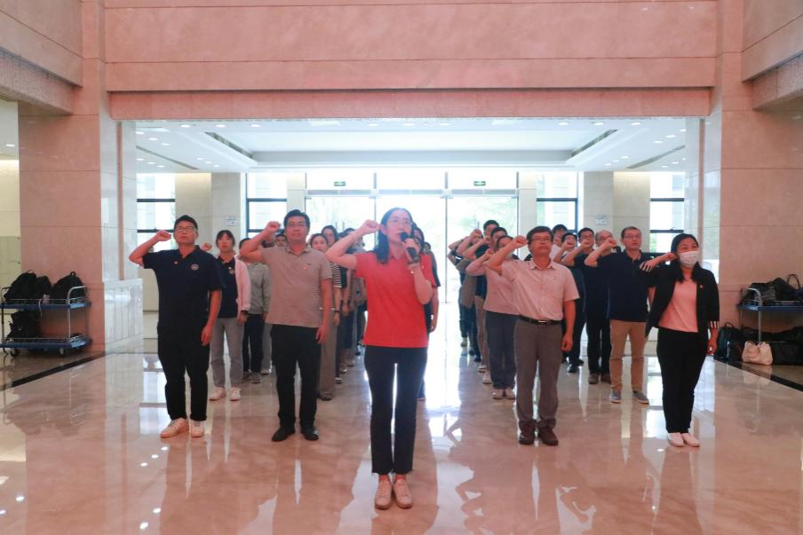 在教育基地一楼大厅,面对鲜红的党旗,学院党委书记郑慧带领全体党员干部,以饱满的精神状态,庄严重温入党誓词。