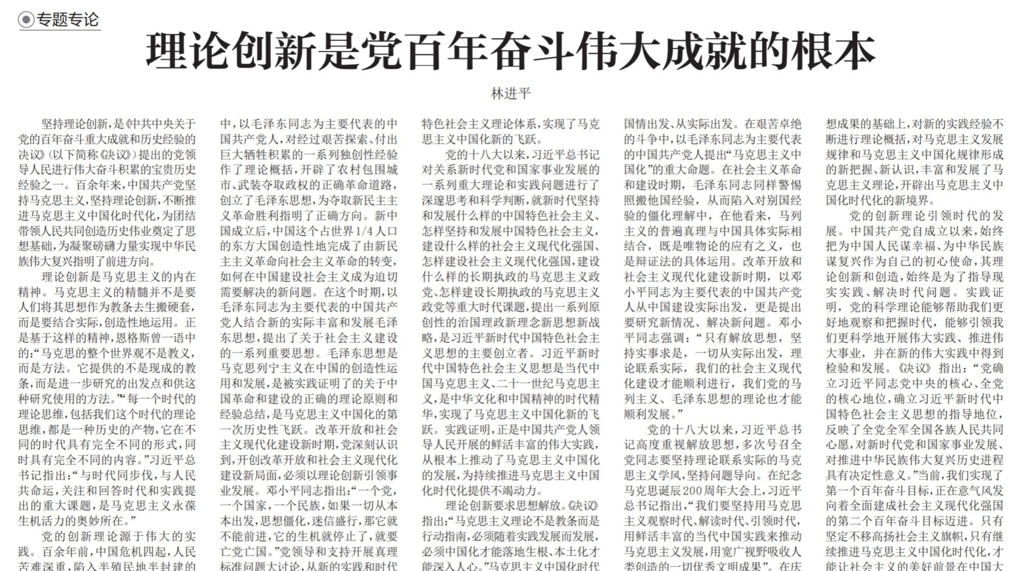坚持理论创新,是《中共中央关于党的百年奋斗重大成就和历史经验的决议》(以下简称《决议》)提出的党领导人民进行伟大奋斗积累的宝贵历史经验之一。百余年来,中国共产党坚持马克思主义,坚持理论创新,不断推进马克思主义中国化时代化,为团结带领人民共同创造历史伟业奠定了思想基础,为凝聚磅礴力量实现中华民族伟...