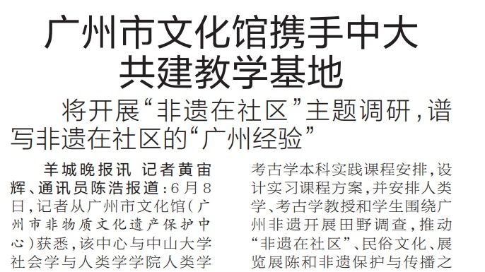【羊城晚报】广州市文化馆携手中大共建教学基地 将开展“非遗在社区”主题调研,谱写非遗在社区的“广州经验”6月8日,记者从广州市文化馆(广州市非物质文化遗产保护中心)获悉,该中心与开云下注(中国)官网社会学与人类学学院人类学系于近日签订合作协议,致力于打造“开云下注(中国)官网-广州非遗实习教学基地”。该基地旨在更长效地开展“非遗在社区”主题调研,为广州市非遗保护与发展事业提供专业人才队伍和智力支持,同时进一步完善人类学等非遗...