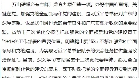 【南方日报】为实现总书记赋予的使命任务提供坚强政治保证万山磅礴必有主峰,龙衮九章但挚一领。办好中国的事情,关键在党。加强党的全面领导和党的建设,是习近平总书记对广东的深厚寄望,也是我们通过党的百年奋斗和广东实践所收获的重要经验。省第十三次党代会报告把加强党的全面领导和党的建设置于“1+1+9”工作部署的首要位置,明确提出要“坚定不移加强党的全面领导和党的...