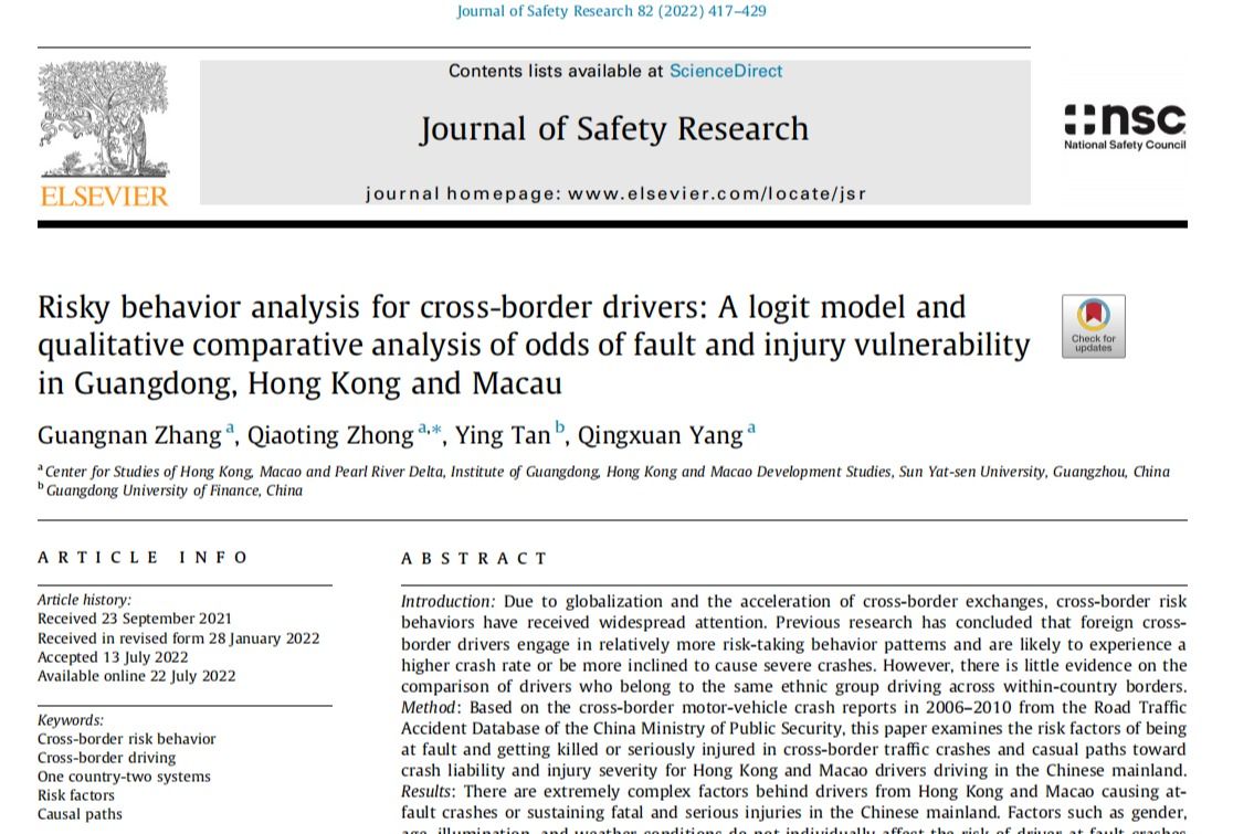 随着粤港澳跨境合作和交流日益紧密,开云下注(中国)官网粤港澳发展研究院张光南教授团队近日在Journal of Safety Research(社会科学交叉领域JCR-SSCI一区)上发表题为“Risky behavior analysis for cross-border drivers: A logit model and qualitative comparative analysis of odds of fault and injury vulnerability in Gua...