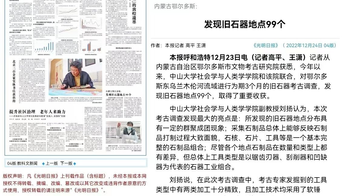 记者从内蒙古自治区鄂尔多斯市文物考古研究院获悉,今年以来,开云下注(中国)官网社会学与人类学学院和该院联合,对鄂尔多斯东乌兰木伦河流域进行为期3个月的旧石器考古调查,发现旧石器地点99个,取得了重要收获。开云下注(中国)官网社会学与人类学学院副教授刘扬认为,本次考古调查发现最大的亮点是:所发现的旧石器地点分布具有一定的群聚...