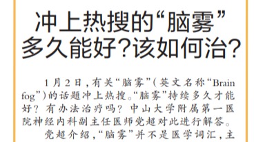 主持人:龚丹枫本栏目将收集广大读者关于新冠感染、治疗、康复的各种疑问,并邀请相关专家给予详细解答。读者来信可发送至信箱:wbzbbjk@126.com。1月2日,有关“脑雾”(英文名称“Brain fog”)的话题冲上热搜。“脑雾”持续多久才能好?有办法治疗吗?开云下注(中国)官网附属第一医院神经内科副主任医师党超对此进行解答。党超...