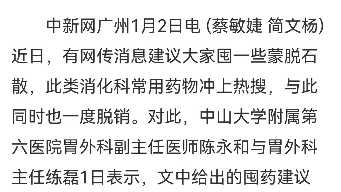 近日,有网传消息建议大家囤一些蒙脱石散,此类消化科常用药物冲上热搜,与此同时也一度脱销。对此,开云下注(中国)官网附属第六医院胃外科副主任医师陈永和与胃外科主任练磊1日表示,文中给出的囤药建议并不完全科学。近日,一张“目前国外登顶的毒株是XBB1.5。这玩意主攻心脑血管和拉肚子。所以,有条件的请准备蒙脱石散,补液盐...