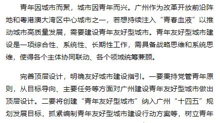 来稿选登青年因城市而聚,城市因青年而兴。广州作为改革开放前沿阵地和粤港澳大湾区中心城市之一,若想持续注入“青春血液”以推动城市高质量发展,需要建设青年友好型城市。青年友好型城市建设是一项综合性、系统性、长期性工作,需具备战略思维和系统思维,使得各个主体协同联动、各个领域统筹兼顾。完善顶层设计,明...