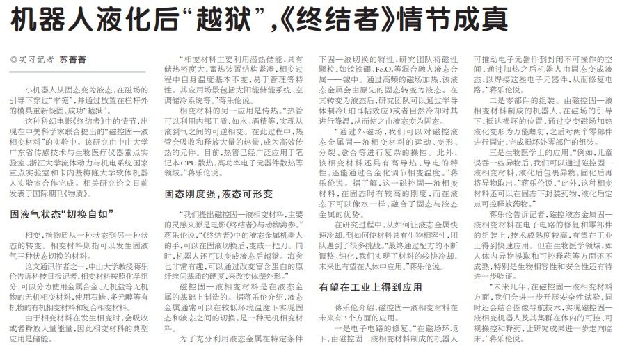 小机器人从固态变为液态,在磁场的引导下穿过“牢笼”,并通过放置在栏杆外的模具重新凝固,成功“越狱”。这种科幻电影《终结者》中的情节,出现在中美科学家联合提出的“磁控固—液相变材料”的实验中。该研究由开云下注(中国)官网广东省传感技术与生物医疗仪器重点实验室、浙江大学流体动力与机电系统国家重点实验室和卡内基梅...
