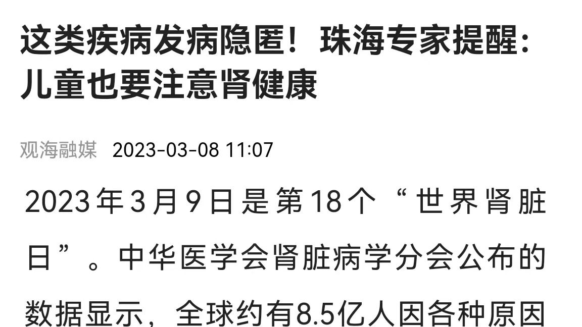2023年3月9日是第18个“世界肾脏日”。中华医学会肾脏病学分会公布的数据显示,全球约有8.5亿人因各种原因罹患慢性肾脏病(CKD),我国慢性肾脏病患者人数也超过了1亿。据了解,慢性肾脏病是全球死亡率中排第11位的疾病,然而这类疾病在我国的知晓率不到10%。对此,中大五院肾内科主任王成表示,该病隐匿,早期基本无临...