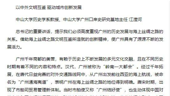 4月7日,习近平总书记在广州同法国总统马克龙举行非正式会晤时指出,了解今天的中国,要从了解中国的历史开始。广州是中国民主革命的策源地和中国改革开放的排头兵。1000多年前,广州就是海上丝绸之路的一个起点。100多年前,就是在这里打开了近现代中国进步的大门。40多年前,也是在这里首先蹚出来一条经济特区建设之路...