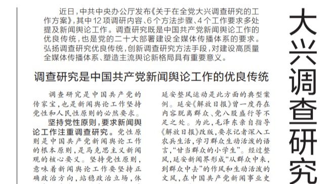 近日,中共中央办公厅发布《关于在全党大兴调查研究的工作方案》,其中12项调研内容、6个方法步骤、4个工作要求多处提及新闻舆论工作。调查研究既是中国共产党新闻舆论工作的优良传统,也是党的二十大部署建设全媒体传播体系的要求。弘扬调查研究优良传统,创新调查研究方法手段,对建设高质量全媒体传播体系、塑造主流...