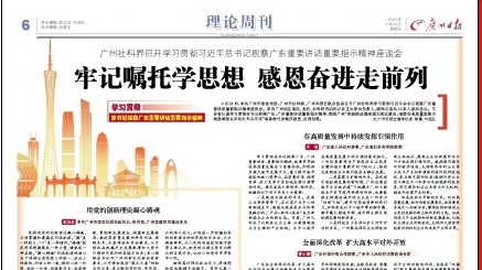4月24日,中共广州市委宣传部、广州市社科联、广州日报社联合组织召开广州社科界学习贯彻习近平总书记视察广东重要讲话重要指示精神座谈会。来自广州地区高校、党校、社科研究机构以及主办单位负责人、媒体记者共40多人参加会议。与会者认真学习贯彻总书记视察广东、广州重要讲话重要指示精神,围绕广州“积极推进粤港澳...