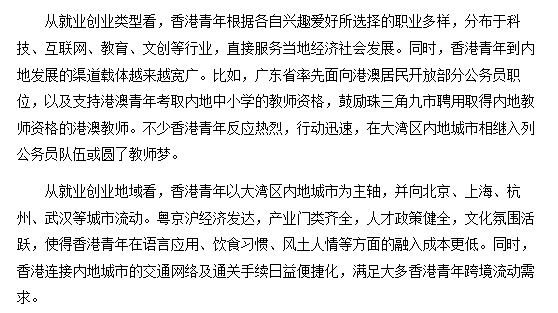 7月24日,习近平主席给香港培侨中学高一年级全体学生回信,勉励他们“早日成长为可堪大任的栋梁之才,为建设美好香港、实现民族复兴积极贡献力量”。香港青年是“一国两制”事业的见证者、参与者和受益者。近年来,随着中央加大政策支持力度和粤港澳大湾区建设进程加快,各种便利香港青年在内地升学、就业、创业的政策措...