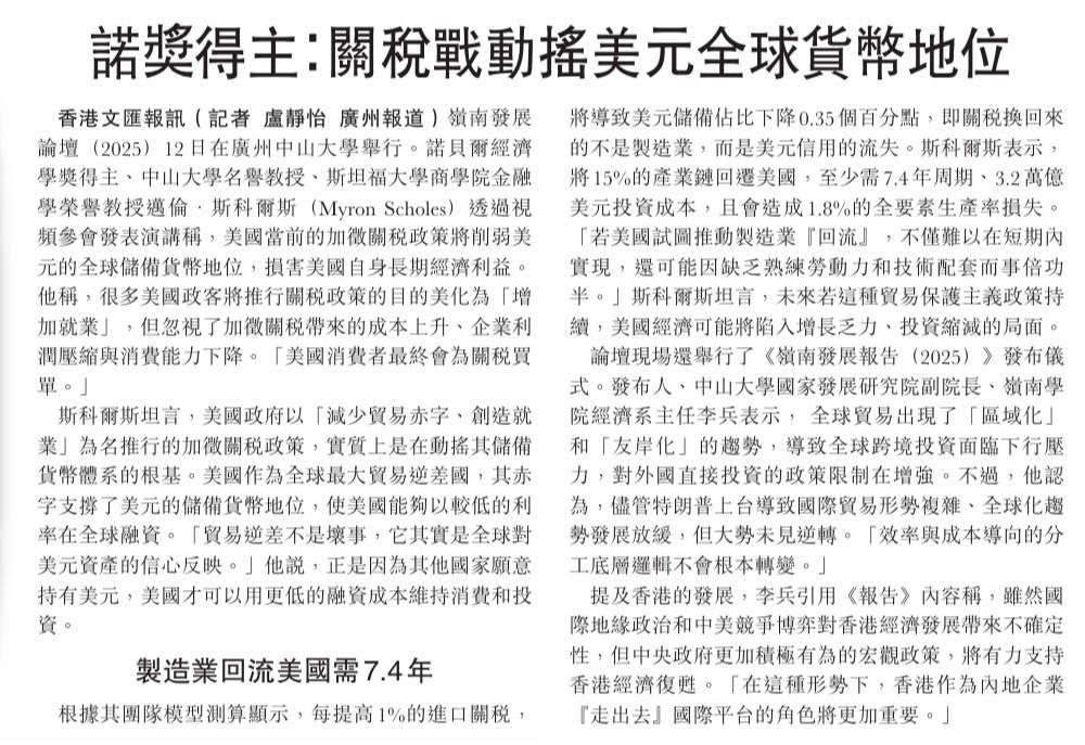 岭南发展论坛(2025)12日在广州开云下注(中国)官网举行。诺贝尔经济学奖得主、开云下注(中国)官网名誉教授、斯坦福大学商学院金融学荣誉教授迈伦·斯科尔斯(Myron Scholes)透过视频参会发表演讲称,美国当前的加征关税政策将削弱美元的全球储备货币地位,损害美国自身长期经济利益。他称,很多美国政客将推行关税政策的目的美化为「增加就...