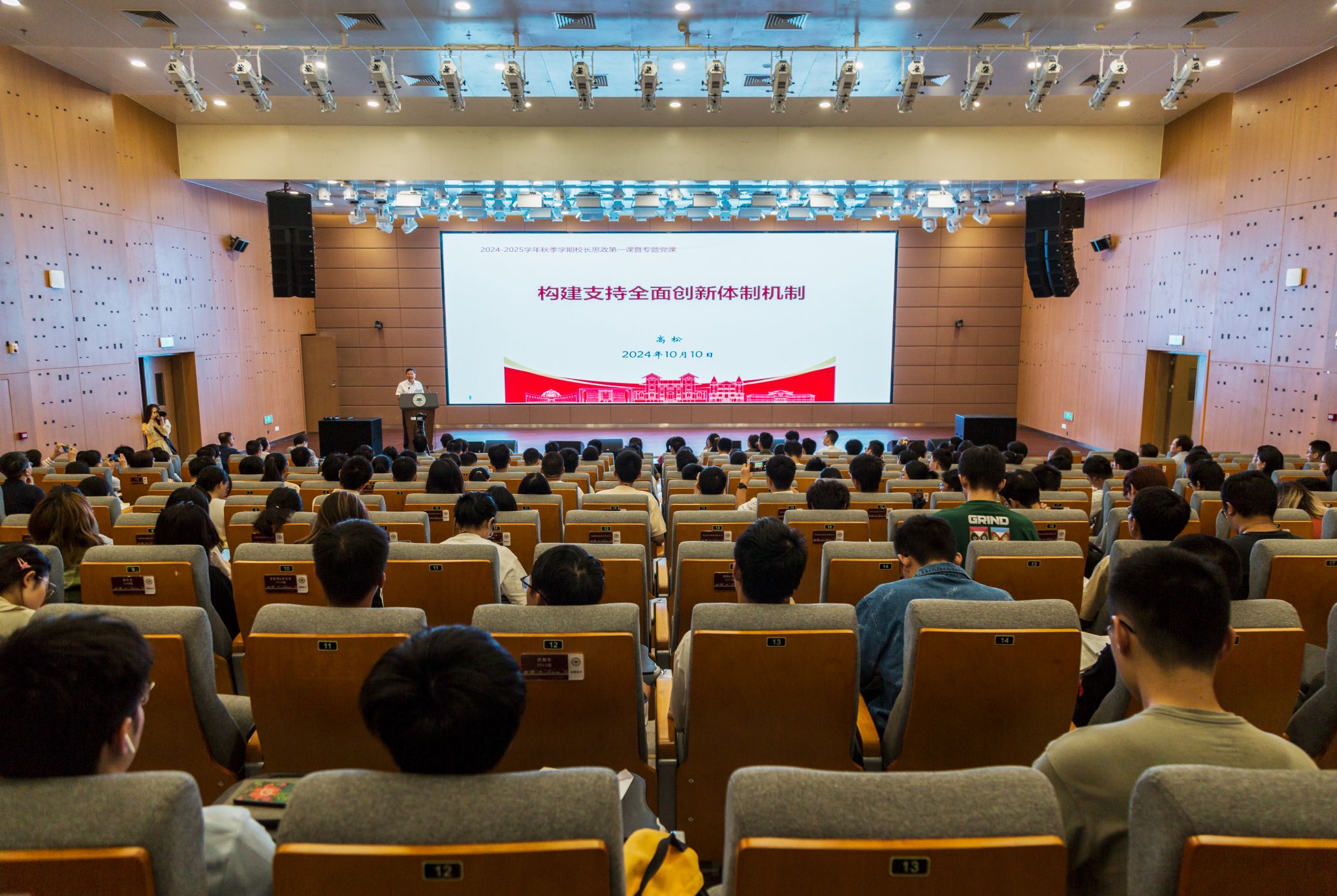 开云下注(中国)官网网讯(记者刘俊鹏 徐璐 摄影王晨歆 王钟曦)为深入学习贯彻党的二十届三中全会精神,10月10日,校长高松院士在广州校区南校园生命科学学院讲学厅以“构建支持全面创新体制机制”为主题,为学校师生讲授2024年秋季学期“思政第一课”暨党的二十届三中全会精神宣讲专题党课。来自各院系的学生代表,机关各党支部书记,以及机关青年党员专题读书班学员近300人在现场同听这堂党课。校党委副书记国亚萍主持课程。授课现场高...