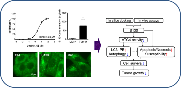 The cysteine protease ATG4B is a key component for autophagy, which is a cellular catabolic pathway involved in energy balance. To help further explore ATG4B functions and potential therapeutic applications, this study integrated in silico screening and in vitro assays to discover a potent ATG4B inhibitor, named S130. Here, the researchers found that S130 did not cause the impairment of autophagosome fusion, instead, S130 might attenuate the delipidation of LC3-II on the autolysosomes to suppress the recycling of LC3-I. Intriguingly, S130 induced cell death, which was accompanied with autophagy stress and could be further exacerbated by nutrient deprivation. Such cytotoxicity could be partially reversed by enhancing ATG4B activity, suggesting that ATG4B may be important for cancer biology. Meanwhile, S130 was distributed in tumor tissues in vivo and was also effective in arresting the growth of colorectal cancer cells. Thus, this study indicates that ATG4B is a potential anticancer target and S130 might be a novel small-molecule candidate for future cancer therapy.