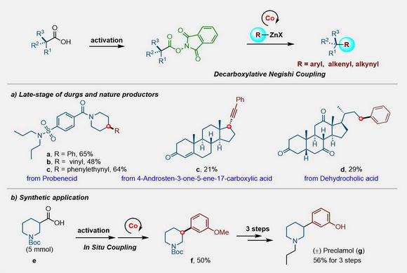 The reported work described an unprecedented cobalt-catalyzed decarboxylative cross coupling of activated aliphatic carboxylic acids with organozinc reagents. The method led to efficient alkyl–aryl, alkyl-alkenyl and alkyl-alkynyl couplings under mild reaction conditions with no external ligand or additive needed. The success of an in situ activation protocol and the facile synthesis of a drug molecule (±)-preclamol highlighted the synthetic potential of this method. Mechanistic studies indicated a radical mechanism is involved.