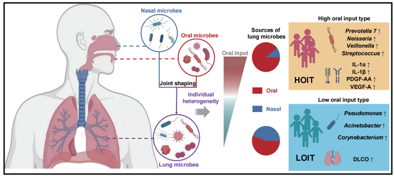 In this study, the research team enrolled 67 patients with lung cancer and 32 volunteers with non-malignant lung diseases and profiled the microbiomes of the saliva, nasal cavity, oropharyngeal area and the bronchoalveolar lavage samples. By integrating multi-omics informatics techniques and statistical modeling, the team found that oral and nasal microbial input jointly shaped the lung microbiota by occupying different ecological niches. The team observed that spread of oral microbes to the lungs were heterogeneous and identified two microbiota pneumo-types, high oral input type (HOIT) and low oral input type (LOIT). They found that in the group of HOIT, there are more of oral microbes entering the lungs with decreased lung function and increased lung proinflammatory cytokines.