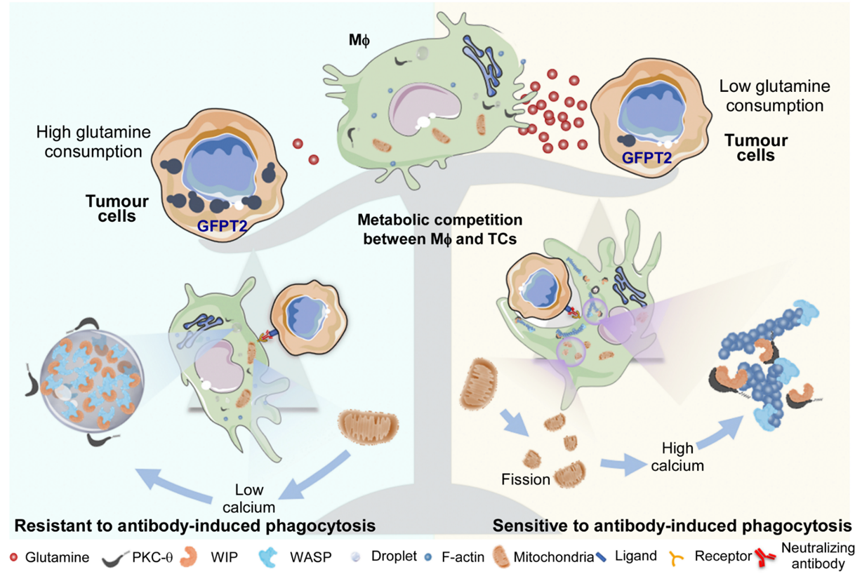 Conclusion, through the study of tumor phagocytosis models mediated by different antibodies, revealing that the competition of glutamine in the tumor microenvironment inhibits mitochondrial fission of macrophages, maintains WIP / WASP phase separation and inhibits that PKC-θ phosphorylated WIP and actin polarization, eventually produces clinical antibody resistance. This study provides a new idea for enhancing the effect of next-generation tumor immunotherapy.