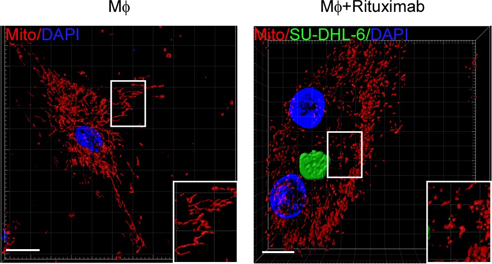 Mitochondria provide energy for immune response (4). The authors discovered circle RNA transcribed by mitochondrial gene regulates fibroblast function by ROS in previous reports (Bioart:Cell-Su Shicheng, Gao Zhiliang and Xu Xiaoding were cooperatied to reveal the mechanism of mitochondrial localized circRNA regulating liver immune metabolic inflammation) (5). The authors want to know that whether the macrophage phagocytosis to tumor cells is regulated by mitochondrial dynamic. When Trastuzumab, Rituximab and CD47 monoclonal antibodies were cocultured with 18 cell types of breast cancer, colon cancer and B cell lymphoma, respectively. The mitochondria of macrophage phagocytized tumor cells remain fission condition as granular and Drp1, a protein regulated mitochondrial fission, is substantially increased. Macrophage fission inhibition by gene deletion or pharmaceutical interrupt phagocytosis ability to tumor cells. Macrophages from wild-type mice were transferred into Csf1op/op tumor burden mice which luck macrophages, promotes antibody-induced phagocytosis to tumor cells and therapy responses, but not the macrophages with Drp1 knockdown. Confirming that mitochondrial fission is necessary for macrophages to effectively phagocytize tumor cells In vitro and in vivo experiments (Fig. 1).