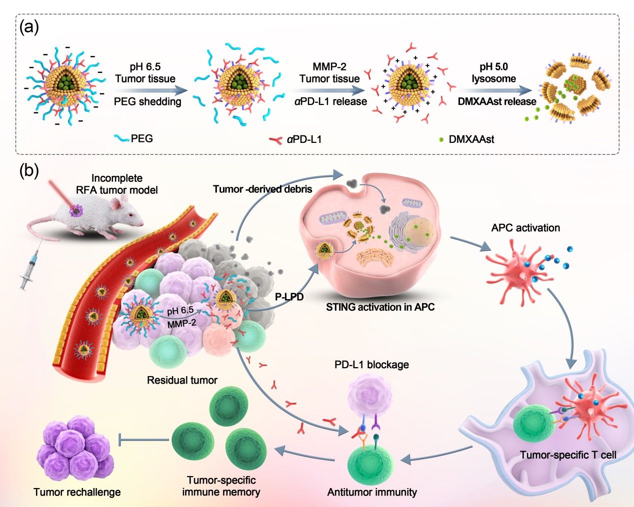 To address the challenges mentioned above, the research group developed a nanovesicle capable of releasing the anti-PD-L1 antibody (αPD-L1) and STING agonist inside tumor in a spatiotemporally controlled manner. The nanovesicle entrapping the hydrophilic STING agonist 5,6-dimethylxanthenone-4-acetate sodium salt (DMXAAst) in its lumen and anchoring αPD-L1 via an MMP-2-sensitive peptide linker was coated with PEG layer sheddable in acidic tumor microenvironment. The nanodrug design allowed the PEG coating to block off-target interaction between αPD-L1 and PD-L1-positive normal cells in blood and normal tissues, thereby reducing the immune-related adverse effects (irAEs). A-PD-L1 was firstly released in response to MMP-2 overexpressed in tumor tissue for ICB therapy, which promote the intracellular delivery of DMXAAst to activate STING in DCs. The synergistic effect of αPD-L1, DMXAAst and RFA evoked a robust anti-tumor immunity and long-term immune memory for a potent cancer therapy.