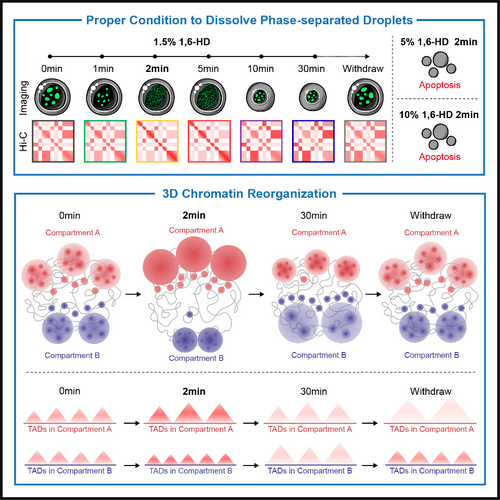 In all, the study finds a proper 1,6-HD condition (1.5%, 2 min) to dissolve phase-separated droplets with limited side effects and provides a time-resolved map of chromatin organization during 1,6-HD treatment. The study demonstrate that 1,6-HD treatment has a time-dependent effects on phase-separated droplets and chromatin organization at different hierarchies. This time-resolved map would serve as a resource for exploring the role of phase separation in 3D chromatin organization.