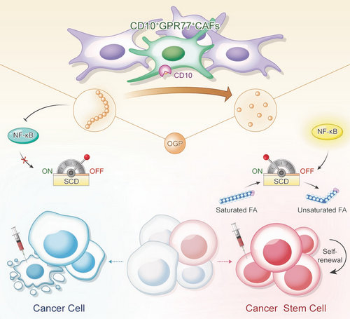 Carcinoma-associated fibroblasts (CAFs) are activated fibroblasts that are key components of the tumor microenvironment. CAFs play a crucial role in tumor progression and have been implicated as promising targets for cancer treatments. However, phenotypic and functional heterogeneity of CAFs hinders this potential. Despite the increasing recognition of the functional diversity of CAFs, definitive surface markers in CAFs for precision therapies are still very limited. Dissecting the therapeutic value of CAF subset markers is important to design more effective therapies that leverage knowledge of the deleterious and beneficial roles of CAFs. Previously, Erwei Song and Shicheng Su’s team identified a subset of CD10+GPR77+ CAFs that promote tumor formation and chemoresistance by providing a survival niche for CSCs. The induction of CD10+GPR77+ CAFs is triggered by complement signaling via GPR77. CD10+GPR77+ CAFs sustain tumor stemness by the secretion of interleukin (IL)-6 and IL-8. However, the role of CD10 in CAFs is unknown. Recently, Shicheng Su from Sun Yat-sen Memorial Hospital, Sun Yat-sen University, revealed a new mechanism of breast cancer stemness sustained by CD10 expressed on cancer-associated fibroblasts. This work entitled " A CD10-OGP Membrane Peptolytic Signaling Axis in Fibroblasts Regulates Lipid Metabolism of Cancer Stem Cells via SCD1 ” is published in Advanced Science on Aug. 7th, 2021. Prof. Shicheng Su from Sun Yat-sen Memorial Hospital, Sun Yat-sen University, is the only corresponding author. Shubin Yu, a doctoral student, Yiwen Lu, an associate research fellow, and An Su, a postdoctoral student are co-first authors.