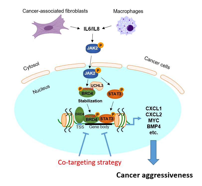 Nature Communications entitled “Stromal induction of BRD4 phosphorylation Results in Chromatin Remodeling and BET inhibitor Resistance in Colorectal Cancer” reported a previously unrecognized mechanism by which the stroma cells in tumor microenvironment promote chromatin reprogramming and BETi resistance through paracrine secretion of cytokines.