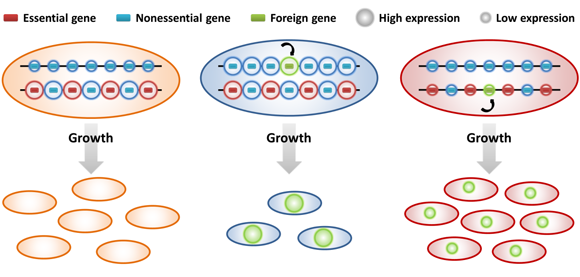 Saccharomyces cerevisiae strains, each with GFP integrated into a different locus of the wild-type strain. They found that in genomic regions enriched in essential genes, GFP expression tended to be lower, and the genes near the integration site tended to show greater expression reduction. More importantly, they found that changes in the expression of neighboring genes, but not GFP expression, are significantly associated with the cellular growth rate. As a result, genomic loci that showed high GFP expression immediately after integration were associated with growth disadvantages caused by elevated expression of neighboring genes, ultimately leading to a low total yield of GFP in the long run.