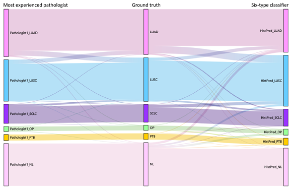 Figure legend: (a) Visualization heatmaps of tissue predictions of LUAD, LUSC, SCLC, PTB, OP, and NL from left to the right, respectively. (b) Sankey diagram illustrates the difference among ground truth, best pathologist and our six-type classifier.