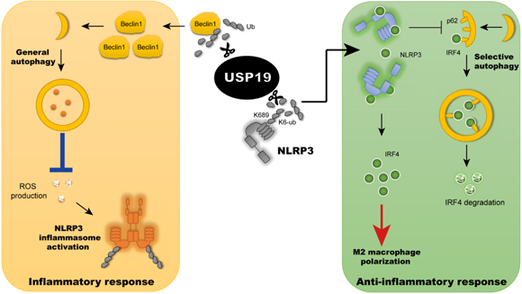 They established an alum-induced peritonitis model and found that Usp19 deficient mice showed robust inflammatory cytokines release, increased neutrophils recruitment and impaired M2-like macrophages polarization. Further study revealed that USP19 inhibited NLRP3 inflammasome activation by increasing autophagy flux and decreasing the generation of mitochondrial ROS. In addition, USP19 inhibited the proteasomal degradation of inflammasome-independent NLRP3 by cleaving polyubiquitin chains. USP19-stabilized NLRP3 promoted M2-like macrophages polarization by direct association with IRF4, thereby preventing its p62-mediated selective autophagic degradation.