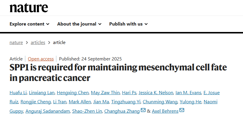 Recently, a collaborative team led by Professor Changhua Zhang from The Seventh Affiliated Hospital of Sun Yat-sen University (SYSU), in partnership with Professor Shaozhen Lin from School of Physics at SYSU and the team of Academician Axel Behrens from The Institute of Cancer Research, has achieved a major breakthrough in pancreatic cancer research. The study for the first time identifies the critical role of osteopontin (SPP1) in regulating mesenchymal cell fate in pancreatic cancer and proposes an innovative therapeutic strategy to reverse pancreatic cancer progression by targeted inhibition of osteopontin. The research paper, titled “SPP1 is required for maintaining mesenchymal cell fate in pancreatic cancer”, was published in Nature on September 24, 2025.