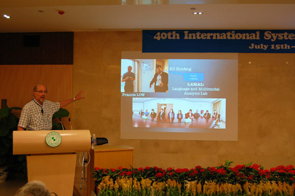 The closing ceremony of ISFC40 was chaired by Professor Wendy Bowcher. Professor Chang Chenguang, dean of School of Foreign Languages, Sun Yat-sen University, made a brief summing-up speech, and Professor Huang Guowen, chair of the executive committee of ISFLA gave a closing speech and expressed gratitude to all those who had helped to make this congress a success. Professor Geoff Thompson, the former chair of ISFLA, expressed thanks to the organizers of ISFC40. Finally, Professor Cecilia Colombi introduced the plans for ISFC41 to be held in Mendoza, Argentina in April next year.