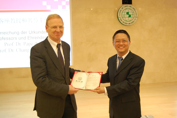 Dean Chang Chenguang (right) presenting the certificate of appointment to Professor Walter Pape (left)