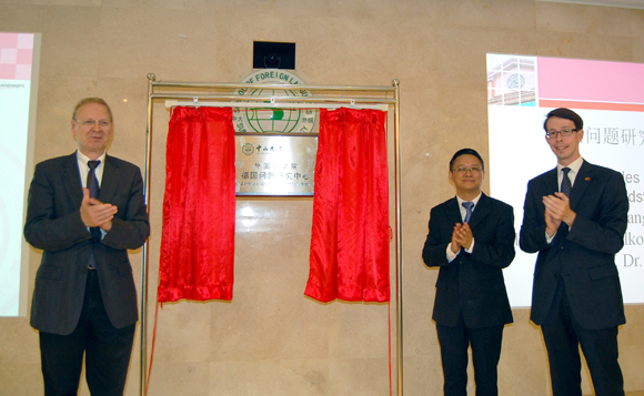 On the morning of October 21, the unveiling ceremony of Center for German Studies, School of Foreign Languages (FLS), Sun Yat-sen University and appointment ceremony for Prof. Dr. Dr. H.c. Walter Pape as guest professor of FLS and honorary director of Center for German Studies was held in FLS Building. Joining the event were Professor Chang Chenguang, Dean of FLS; Dr. Xu Dongli, Secretary of FLS; Dr. Jochen Künzel, Deputy Consul General of the Consulate General of the Federal Republic of Germany in Guangzhou; Prof. Dr. Dr. h.c. Walter Pape and Prof. Dr. Karl-Heinz G.ttert at the University of Cologne (UoC); and Prof. Dr. phil. Wang Beibei, head of the Department of German of FLS. Teachers and students from the Department of German also attended the ceremony.