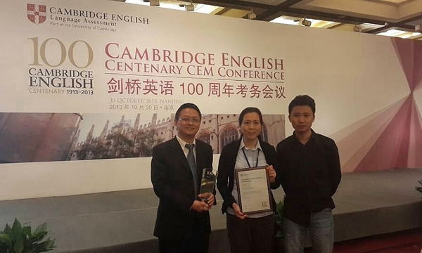 During the recent Cambridge English Centenary CEM Conference, Sun Yat-sen University Cambridge English Examinations Center, administered by School of Foreign Languages (FLS) was awarded in recognition of its “outstanding contribution to the Cambridge English Language Assessment mission in China”. In addition, Professor Chang Chenguang, Dean of FLS, Associate Professor Liao Haiqing, Vice Dean of FLS, and Mr. Zhang Jingxun, Vice Director of Administration Office of FLS, were also cited for their individual outstanding contribution.