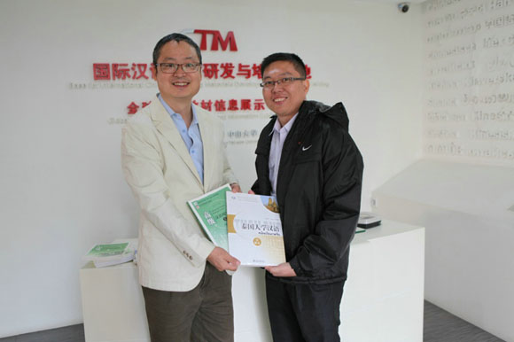 Deputy Director Zhang Shitao bestowed Chinese textbooks to Dr. Chea Munyrith.