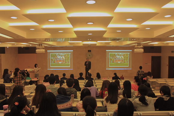 Following Emily Perkins, the celebration turned to creative performance. First, three talented student readers — Zou Yuwei, Zheng Jinqiang, and Chen Xinyi — read from original creative work on topics ranging from how names are chosen, to marginalized communities, to the love a girl feels for her violin. Then, in the spirit of a Center project called “Go Beyond the Boundaries,” in which SYSU students are encouraged to push themselves creatively, Professor Dai Fan and two senior students, Huang Yang and Chen Zhiyong, performed an original skit entitled “Itchy.” Finally, a group of small children from Shenzhen Lenture Education Technology Co. Ltd., led by a former SYSU student, gave a charming performance in English of “Three Axes”.