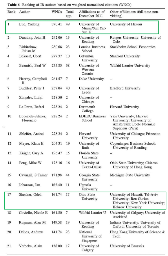 The table below presents the 50 most prolific authors in IB research, ranked in terms of their impact. Dr. Yadong Luo, distinguished honorary professor of Sun Yat-sen Business School (SYSBS), is ranked first among those 50 leading authors. Dr. Oded Shenkar, also a distinguished honorary professor of SYSBS, is positioned at 17th in the MIR ranking.