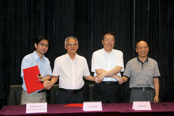 Zhu Guanglei, Vice President of Nankai University, Ma Jun, Vice President of Sun Yat-sen University, Du Ping, Executive Deputy Director of State Information Center, and Shi Peihua, Director of Center for Science and Technology Innovation Program of National Tourism Industry, signed the agreement on joint construction of the collaborative innovation center for modern tourism industry development.