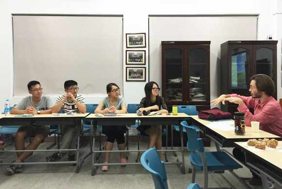 The first Literary Tea of the semester, sponsored by the Department of English, took place on Friday, October 16, 2015. Austin Woerner, who has recently joined the faculty of the School of Foreign Languages as a foreign instructor, gave a Book Club talk titled “Reversing the Tapestry: Adventures of a Literary Translator”. Woerner has earned his BA in East Asian Studies from Yale University and his MFA in Creative Writing from The New School, where he was the assistant to the program director Robert Polito. The event was attended by a dozen undergraduates and as well as members of the department, including the department head, Professor Dai.