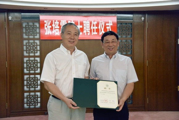 President Luo Jun (left) presenting the letter of appointment to Academician Zhang Peizhen (right)